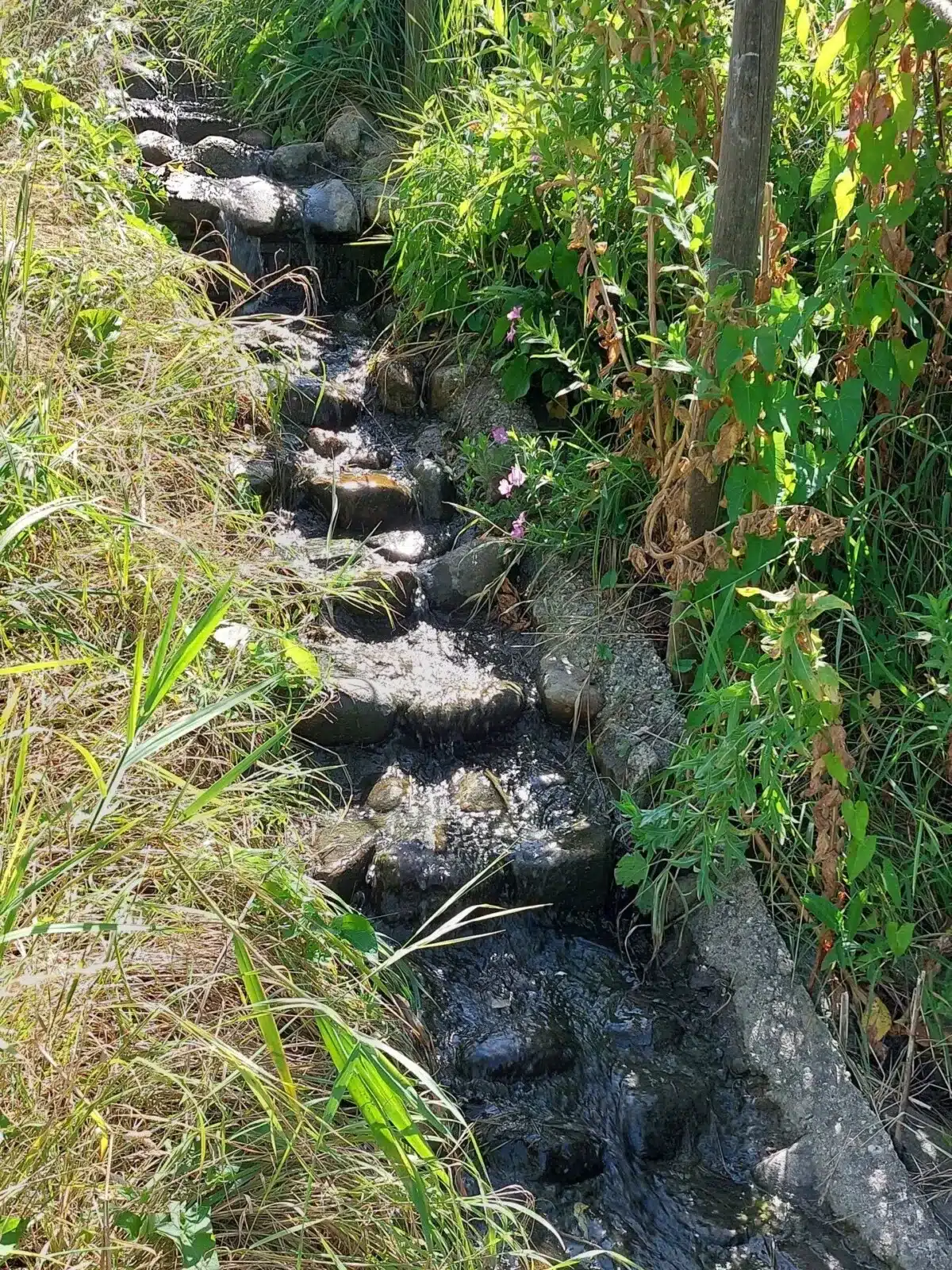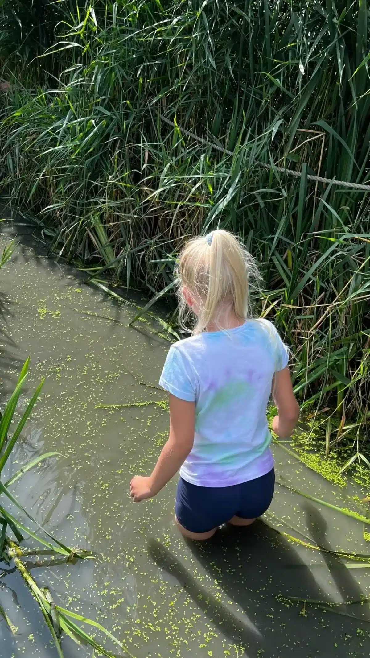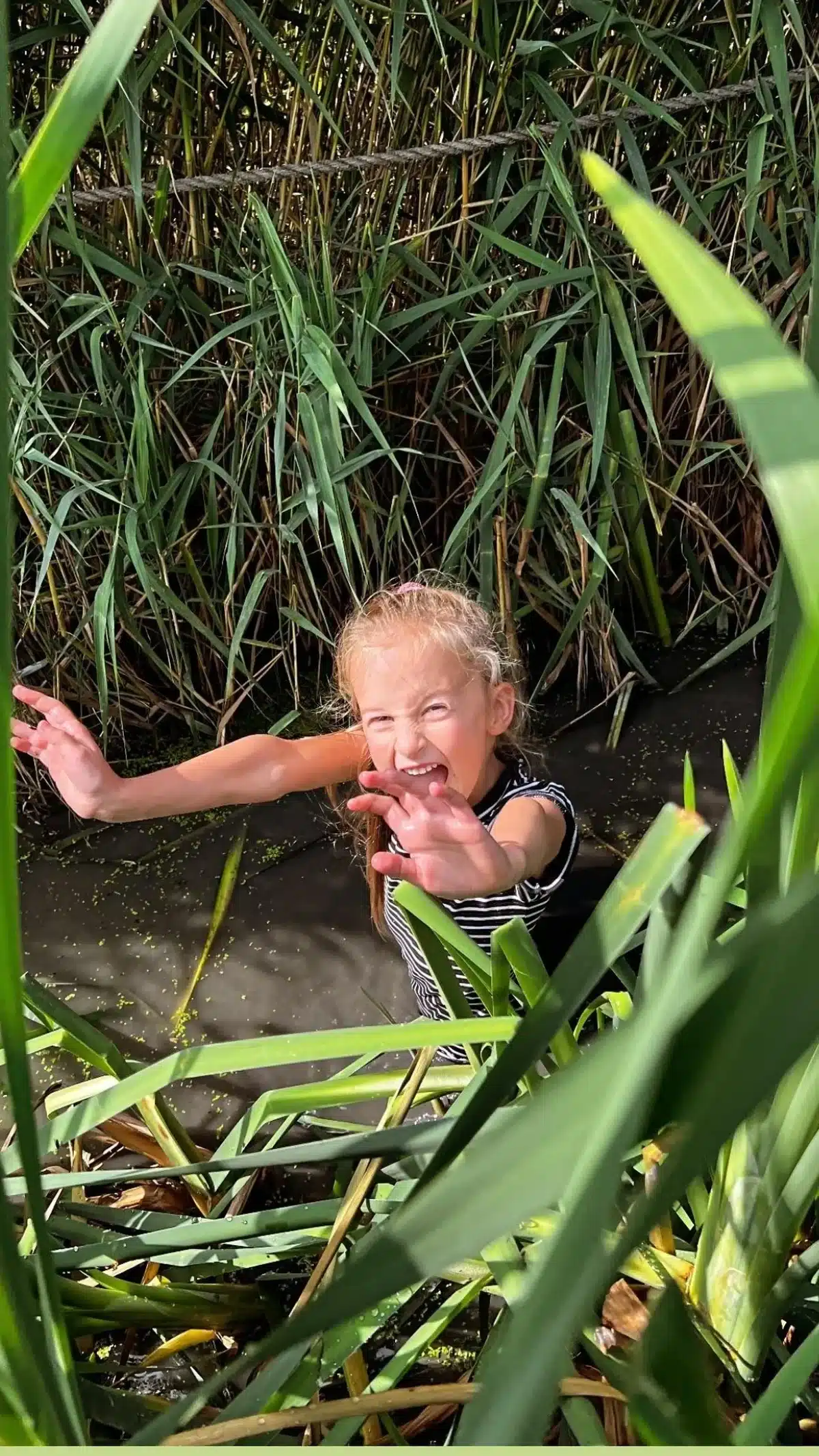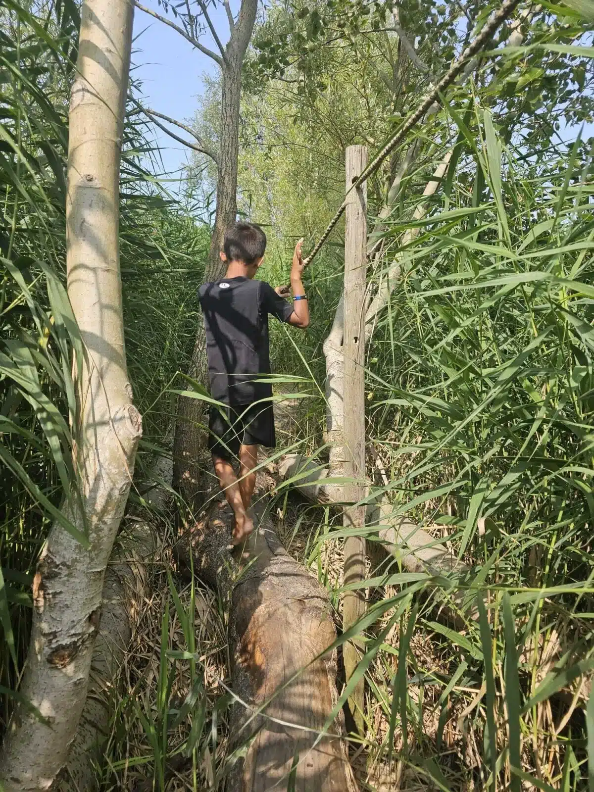 - wandelen door grasvelden, over boomstammen, modderige stukken en ondiep water